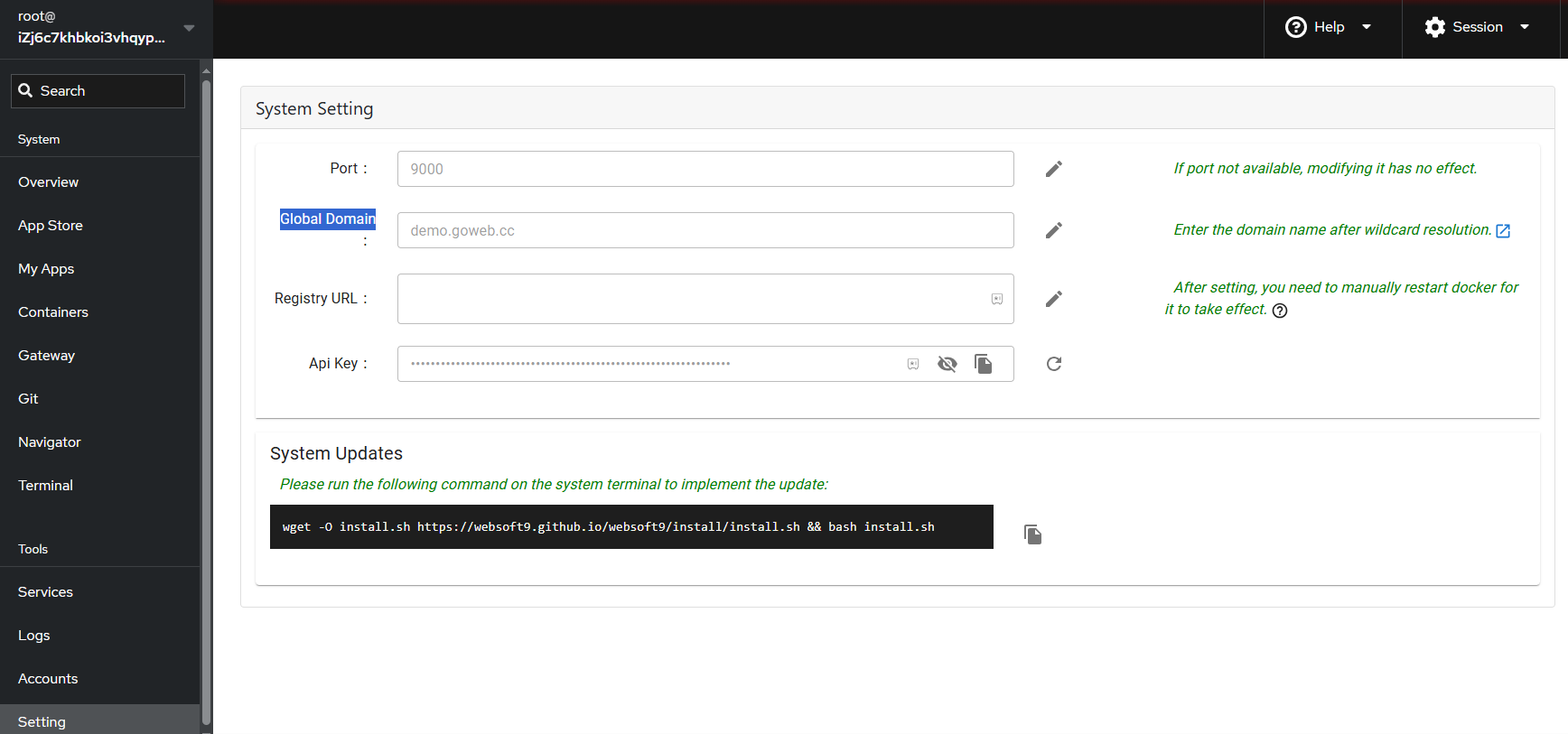 Sign in to your Websoft9 instance as an administrator, on the left sidebar select Settings >System Setting